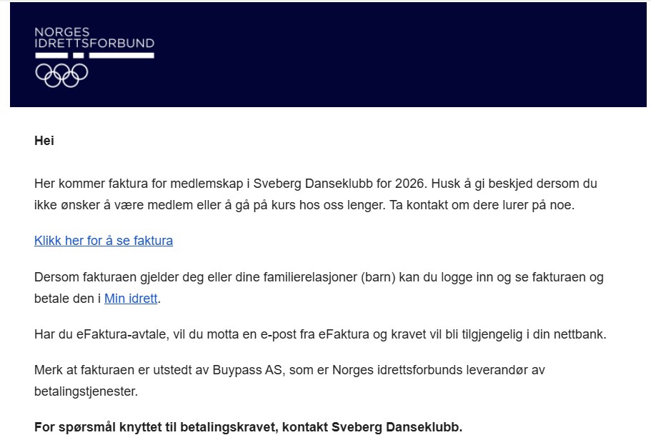 Fakturaen kommer som epost samt tilgjengelig i Min idrett.